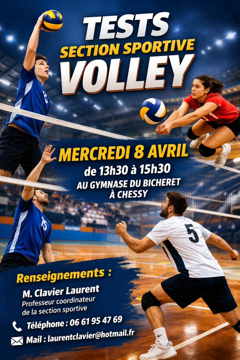 𝗟𝗲𝘀 𝘁𝗲𝘀𝘁𝘀 𝗽𝗼𝘂𝗿 𝗹𝗮 𝘀𝗲𝗰𝘁𝗶𝗼𝗻 𝘀𝗽𝗼𝗿𝘁𝗶𝘃𝗲 𝘃𝗼𝗹𝗹𝗲𝘆 𝗱𝘂 𝗰𝗼𝗹𝗹𝗲̀𝗴𝗲 𝗟𝗲 𝘃𝗶𝗲𝘂𝘅 𝗖𝗵𝗲̂𝗻𝗲 𝗽𝗼𝘂𝗿 𝗹𝗲𝘀 𝗳𝘂𝘁𝘂𝗿𝘀 𝟲𝗲 𝗮𝘂𝗿𝗼𝗻𝘁 𝗹𝗶𝗲𝘂 𝗹𝗲 mercredi 8 avril 2026 de 13h30 à 15h30 au gymnase du Bicheret.