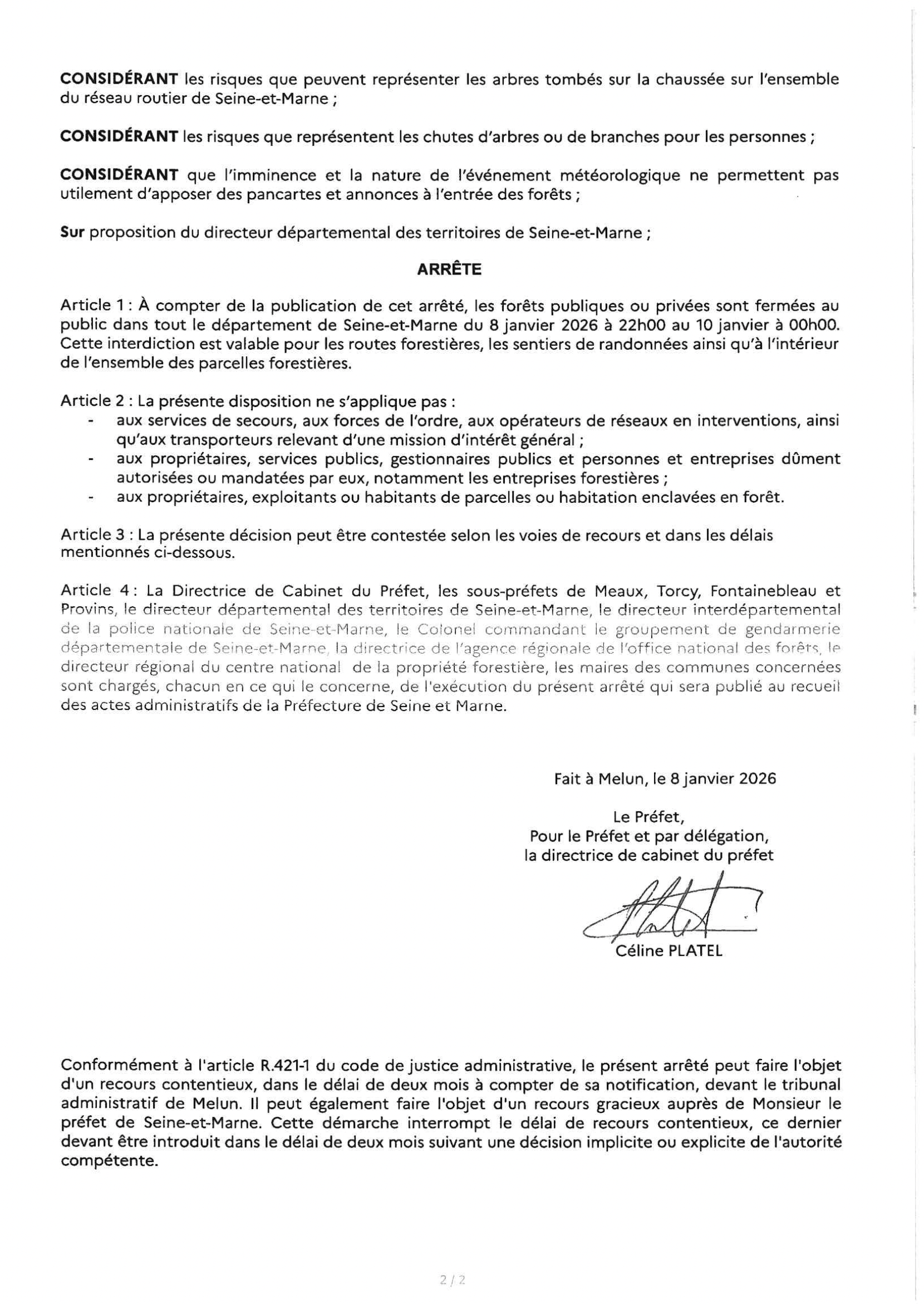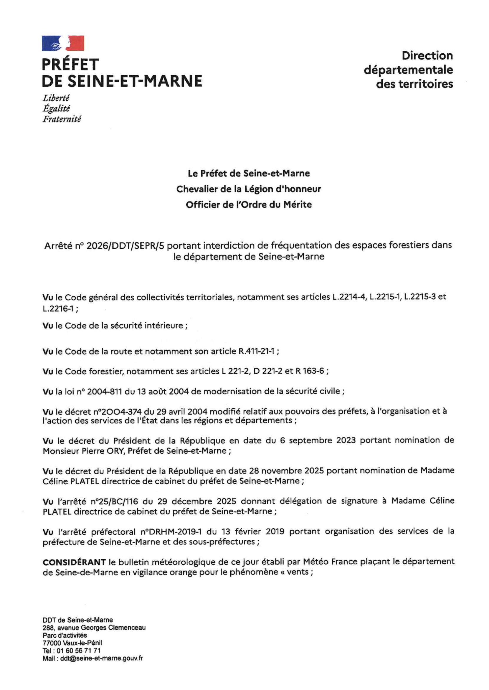 🌳⛔️Dans ce contexte, le préfet de Seine-et-Marne a pris un arrêté interdisant l’accès aux forêts publiques ou privées dans tout le département de Seine-et-Marne jusqu'au 10 janvier à 00h00. Cette interdiction est valable pour les routes forestières, les sentiers de randonnées ainsi qu'à l'intérieur de l'ensemble des parcelles forestières.